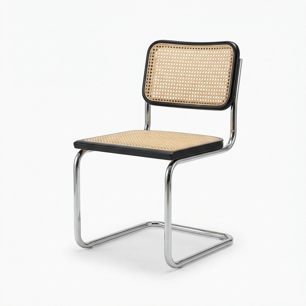 Modelo inspirado en la silla Cesca del arquitecto modernista Marcel Breuer. Las sillas Cesca se destacan por su estilo minimalista, funcionalidad y elegancia atemporal. Asiento y espaldar en madera flor morado, con tejido en mimbre natural y estructura en tubo metálico redondo color plateado. Acabado en madera natural, miel o negro.
